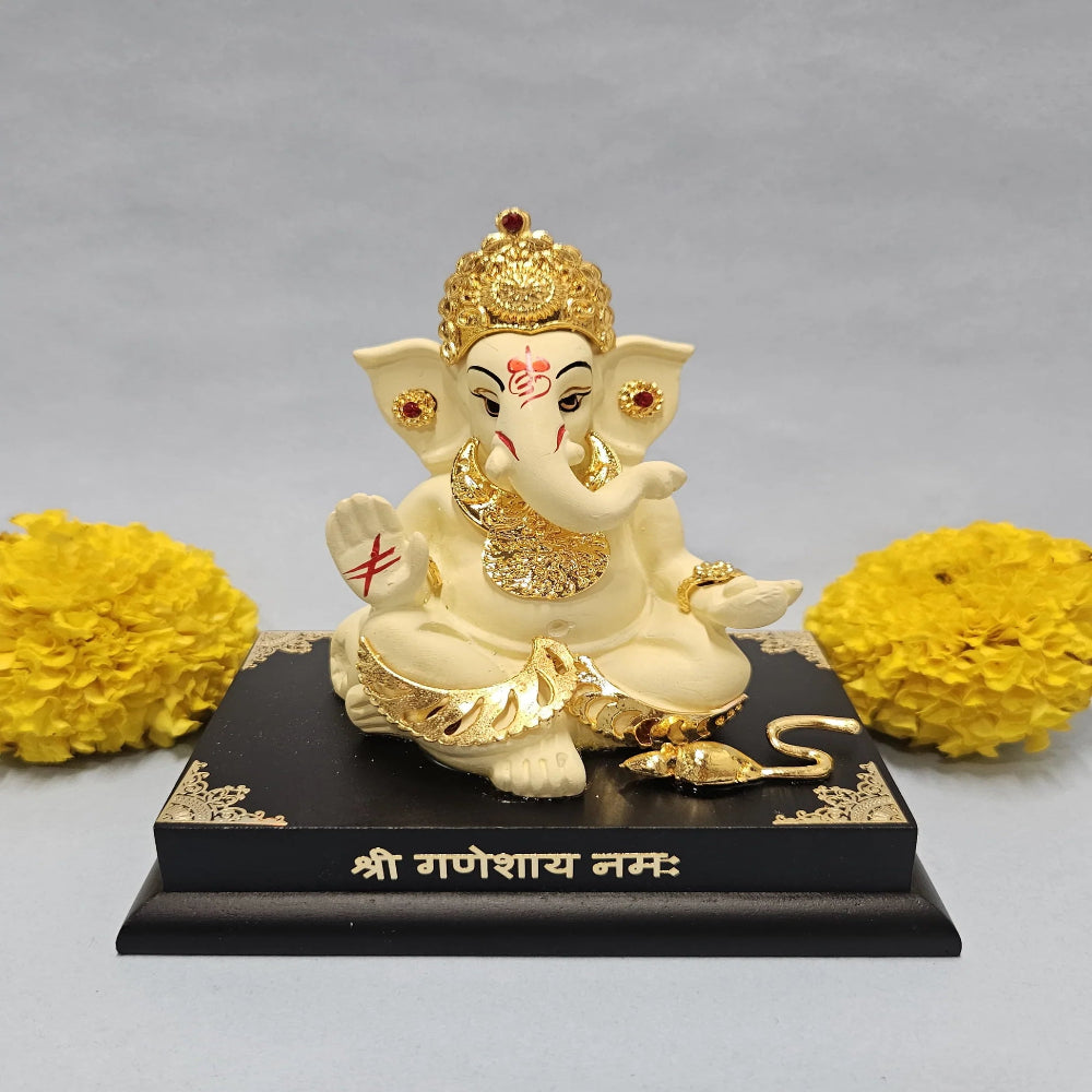 This Lord Ganesha idol features a gold-plated finish, measuring 4.5 inches in height.